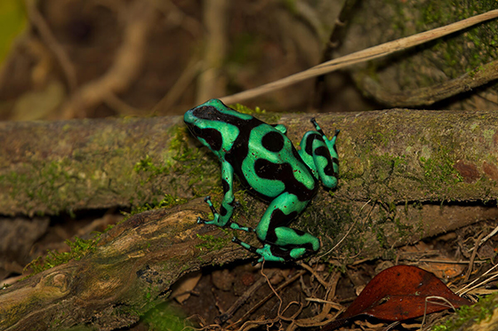 南米に生息するカエルの一種です。鮮やかな色や模様が特徴的。野生の個体は体内に毒素を含むアリを主食とすることで、皮膚に毒性を持ちます。