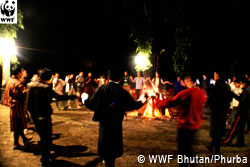 続いて、ブータンの正装「ゴ」に身を包んだ7名のレンジャーが、伝統的な踊りを披露。最後には、ツアー参加者も加わった大きな踊りの輪が、キャンプファイヤーをとり囲みました。